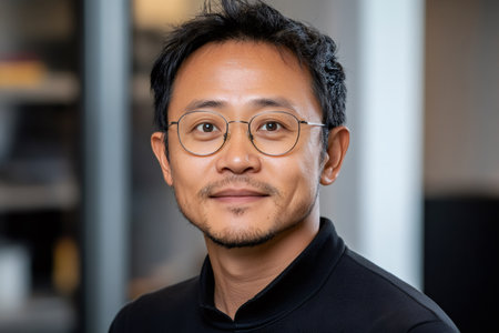 Snapshot of youthful Asian male against backdrop.