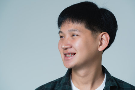 Asian man braces. Teeth braces on the white teeth of man to equalize the teeth. Bracket system in smiling mouth, close up photo teeth, macro shot, dentist health concept.