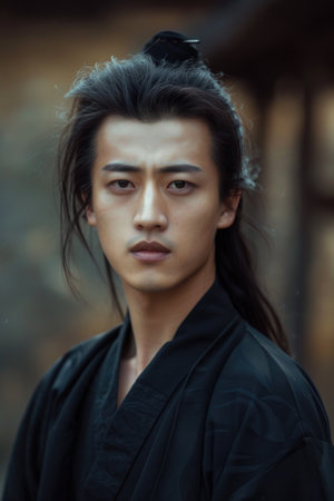 Portrait of young Asian man with dark long hair in traditional clothes looking at camera