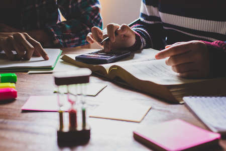 Time or clock Asian young man and woman sitting pointing studying examining, Tutor books with friends Young students campus helps friend catching up and learning. People learning education