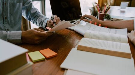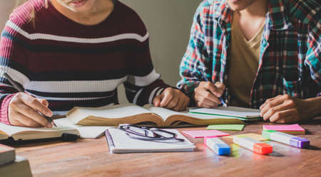 Asian young man and woman sitting pointing studying examining, Tutor books with friends Young students campus helps friend catching up and learning. People learning education
