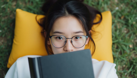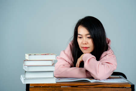 Portrait of an Asian girl wearing a pink shirt. reading a book nice back background gray studio