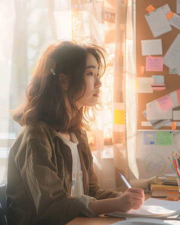 A young woman sits at her desk, lost in thought while writing. The soft morning light filtering through the window creates a serene atmosphere, emphasizing the quiet and reflective nature of her study session. This evokes a sense of focus, inspiration, and peaceful contemplation.