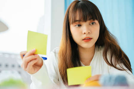 Young asian dark hair woman writing and planning works on sticky note paper.