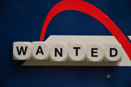 Search for employees to work. The word WANTED in colored wooden letters on a blue background.
