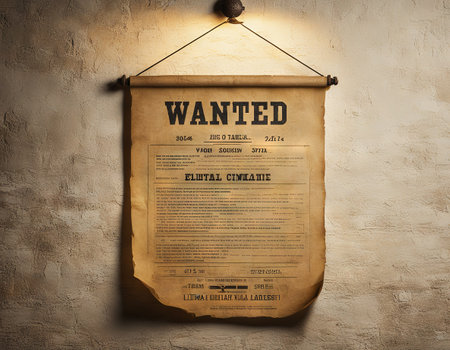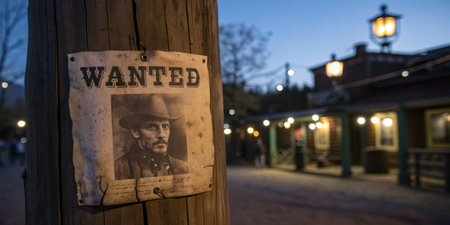 A weathered wanted poster hangs on a post, casting intrigue in a dimly lit western town.