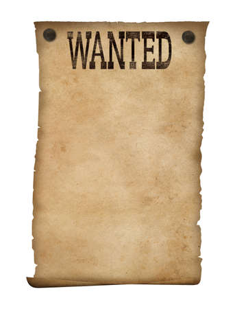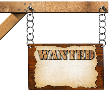 Dark wooden sign with torn empty parchment with text Wanted. Hanging from a metal chain on a wooden pole and isolated on white background
