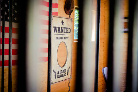 Escape conception - twisted grating. Vintage Wanted poster on the wall