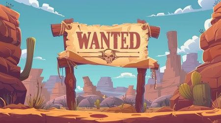 Wild west desert landscape with rocks and cacti. Wanted sign on parchment hanging on wooden board with skull, Western billboard for criminal search..
