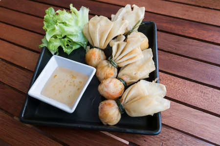 Deep fried shrimp dumplings with sauce on wooden table in Thailand
