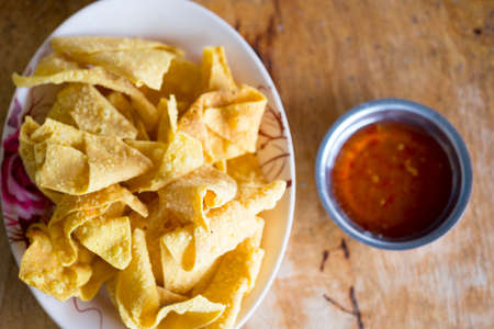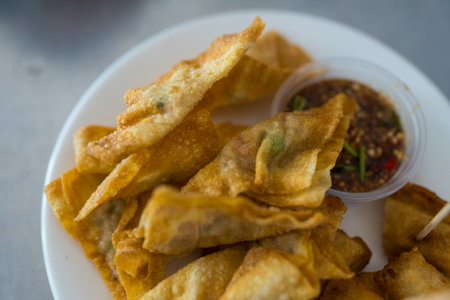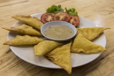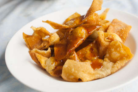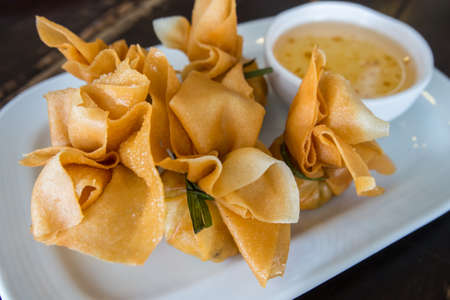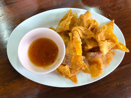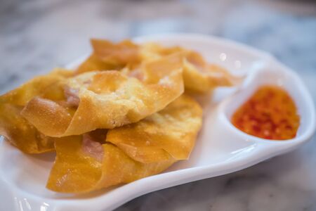 Crispy fried wonton with the pork in the traditional Thai style and the sweet chili sauce on the white plate.(Select focus)