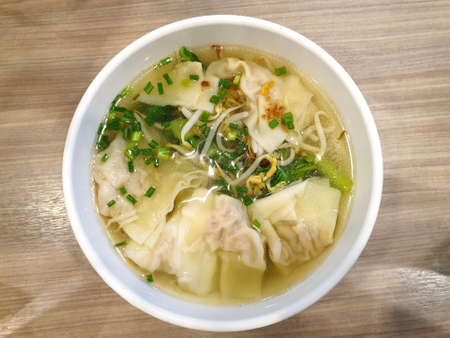 Top view of shrimp wonton with bbq pork and clear soup topped with sliced scallion in white bowl, Kiao Nam is Thai traditional