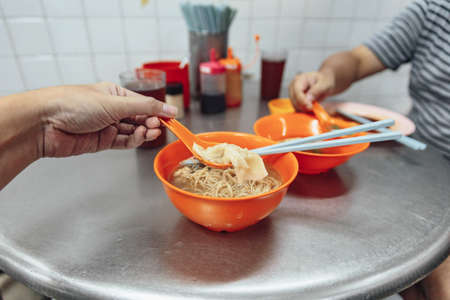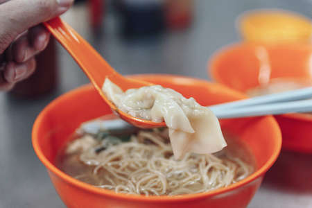 Hand made noodle with soup, chicken and wantons in Kuala Lumpur, Malaysia.