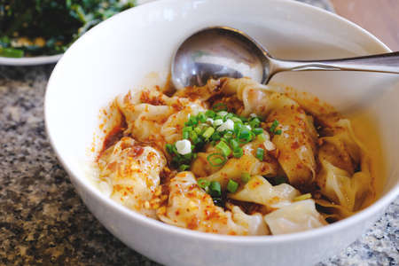 wonton soup. Bowl of wonton soup with chili oil. Shrimp or meat dumpling soup with mustard , green onions,