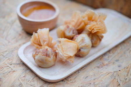 Thai style deep-fried pork dumpling serving with sweet sauce