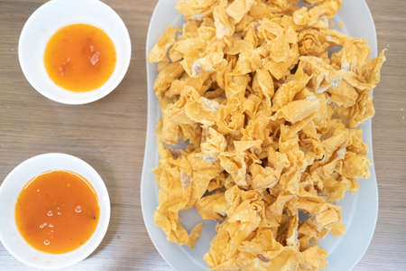 Deep fried Wonton pastry with Thai sweet chili sauce on wood table