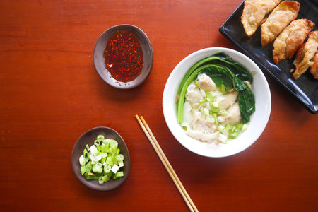 pork wonton soup or pork dumplings soup with roasted chili - Asian food style