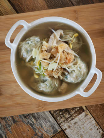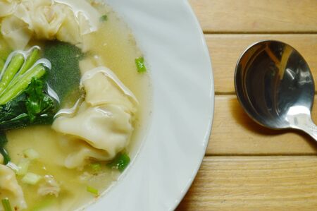 Shrimp wonton with braised pork in soup on wooden table / Select focus image