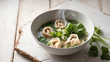 AI Generated. Steaming Bowl of Wonton Soup, Garnished with Fresh Greens, on Rustic Wooden Background