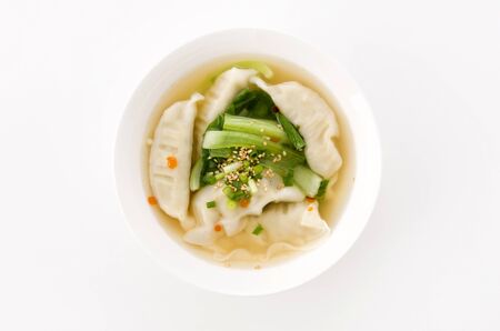 Wonton soup with spring onion served in a white bowl, selective focus