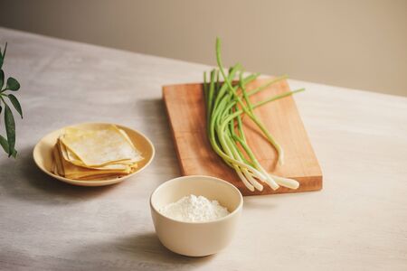 Wrapping Wonton and raw ingredients isolated at kitchen