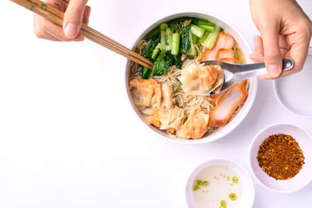Noodles soup with wonton dumpling and grilled red pork in bowl on white background, Asian food, Top view