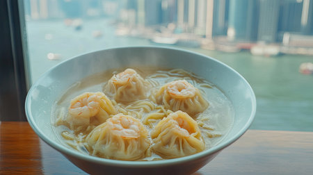 A bowl of steaming dumplings with shrimp and noodles, set against a stunning waterfront city view. Perfect for food lovers seeking a cozy meal.
