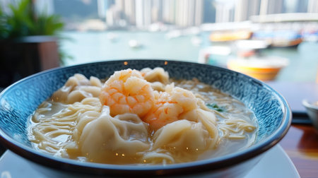 A delicious bowl of fresh shrimp wonton noodles served with scenic harbor views, showcasing vibrant colors and inviting textures perfect for a gourmet meal.