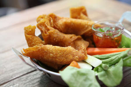 Fried crispy dumpling wrapped pork served dipping sweet and spicy sauce
