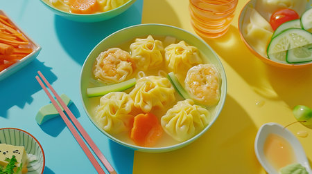 Asian Soup with Wontons and Shrimps, Garnished with Cucumber. Vibrant Culinary Still Life
