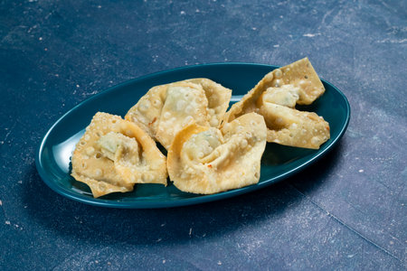 Pangsit, Pangsit Goreng, Delicious Pangsit Ayam Goreng (Chicken Fried Dumpling), Indonesian Traditional Food made from flour and chicken. Served on plate. Selective focus and close up image.