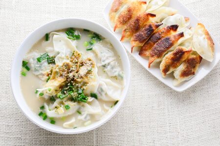 A bowl of noodles with chinese dumplings