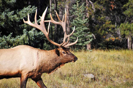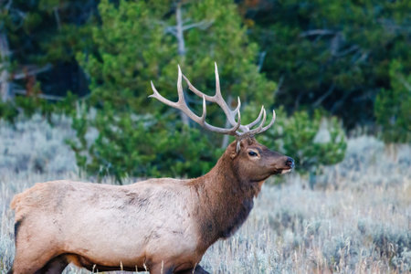 Close up of a Bull elk (Cervus canadensis) standing in meadow near pine trees in Grand Teton National Park, Wyoming during early fall.