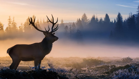 A majestic stag stands silhouetted against a misty forest backdrop at dawn. The soft light filters through trees, creating a serene and tranquil atmosphere.