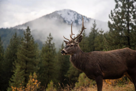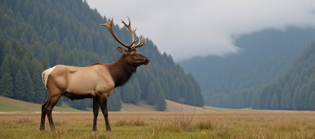 A regal elk stands prominently in a breathtaking mountainous landscape. the blurred, misty mountains serve as a serene backdrop, the elk's impressive antlers and muscular build. perfect for nature enthusiasts and wildlife photography. Generative AI