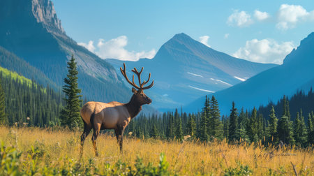 An elk is peacefully grazing in a grassy field with towering mountains in the background. The majestic animal is surrounded by natures beauty, foraging for food in its natural habitat.