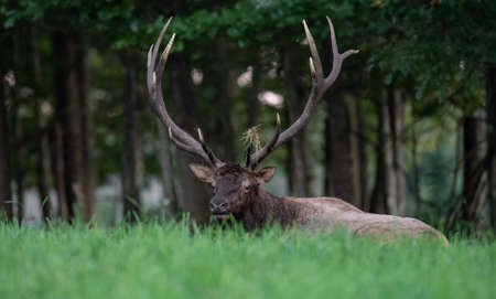 Closeup of A magnificent red deer with sprawling antlers standing on green forest