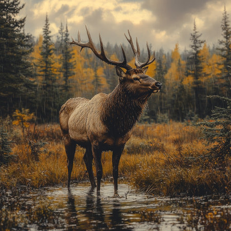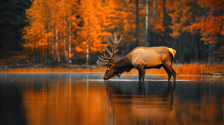 Majestic elk drinking from a calm lake, surrounded by autumn trees