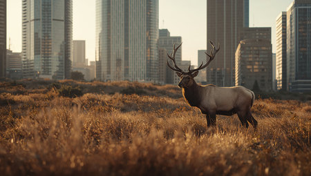 Majestic elk with large antlers standing in a golden grass field, contrasting against the modern skyscrapers of a city skyline in the background during sunset.