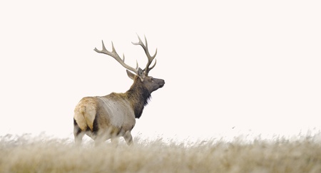 Majestic stag standing alone in a foggy white landscape, embodying strength and solitude in nature. A captivating wildlife scene showcasing its impressive antlers.