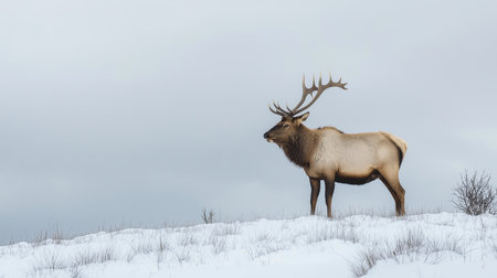 Elk with impressive antlers surveys the snowy terrain and cloudy sky in a tranquil winter setting