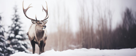 A majestic deer with antlers forages for food in a snow-covered forest, surrounded by frosted pine trees.