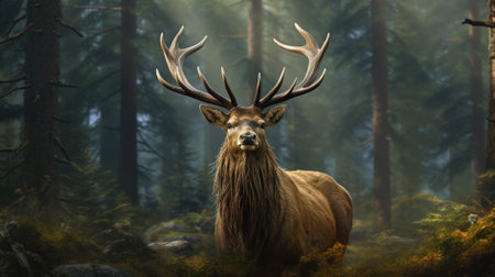 A majestic stag stands in a mystical, misty forest, showcasing its impressive antlers. The serene ambiance highlights the beauty of wildlife in its natural habitat.