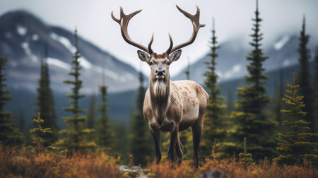 a majestic canadian caribou gracefully poses in front of a bokeh-filled background, creating a captivating shot. amidst the overcast weather, the lighting enhances the tiger's presence. achieve breathtaking results by capturing this stunning moment in high resolution, ensuring every intricate detail is preserved. keywords: tiger photo, canadian caribou, bokeh-filled background, overcast weather, perfect lighting, high resolution, intricate details. ai generated