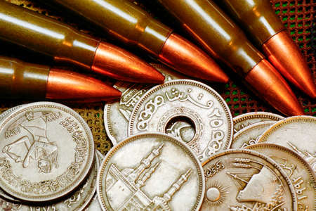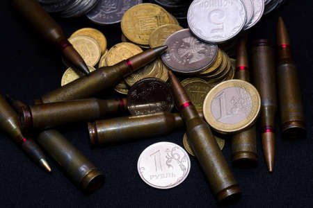 One euro, Russian ruble and small Ukrainian coins with rifle military ammo on black background. Symbolizes war for money- biggest problem in world.
