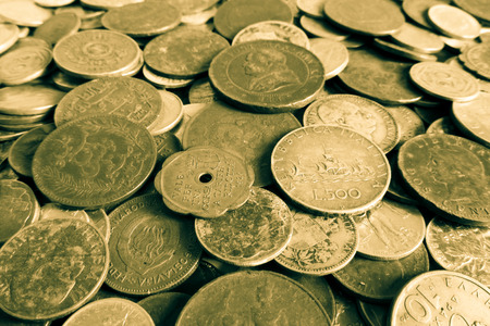 Old vintage fake coins background for sale to tourists in the Indian market on the street in Rishikesh, India. Close up, top view