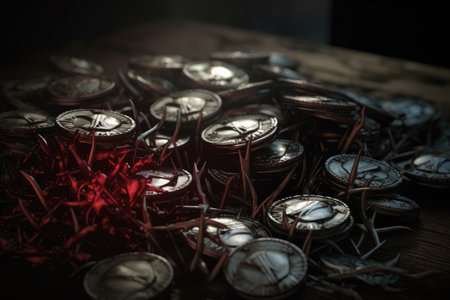 Judas 30 pieces of silver, sack thirty coins biblical symbol betrayal, religion, Bible A crown of thorns with thorns, a noose gallows ,creative reproduction of history Jesus Christ God.
