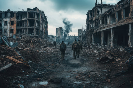Amidst the rubble of shattered buildings, soldiers patrol the desolate streets, highlighting the impact of conflict and destruction.