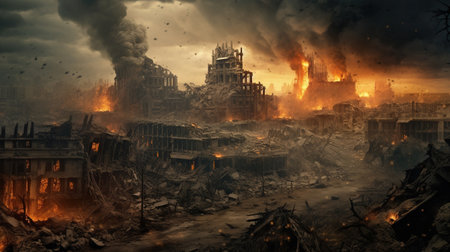 AI Generated. A city destroyed by rocket attacks is shrouded in fire and smoke