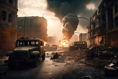 Illustration of a city destroyed by bombs, the effects of war. generative AI